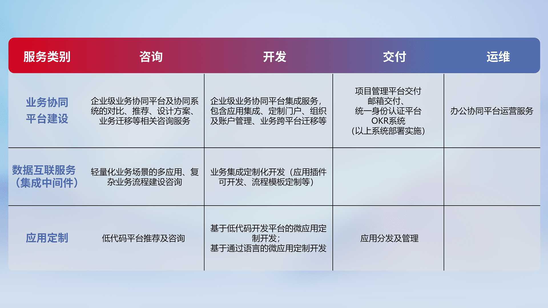 针对钉钉、、企微、、、IDaas等平台级产品提供产品的规划、、方案、、、、交付、、定制化开发等服务,,实现如统一协同办公、、、、智能客户服务、、、混合会议管理、、智能数据查询、、、等业务场景,,,,实现数字化转型。。